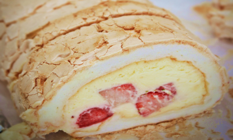 Meringue Roll is a delicious combination of soft meringue, cream and strawberries.